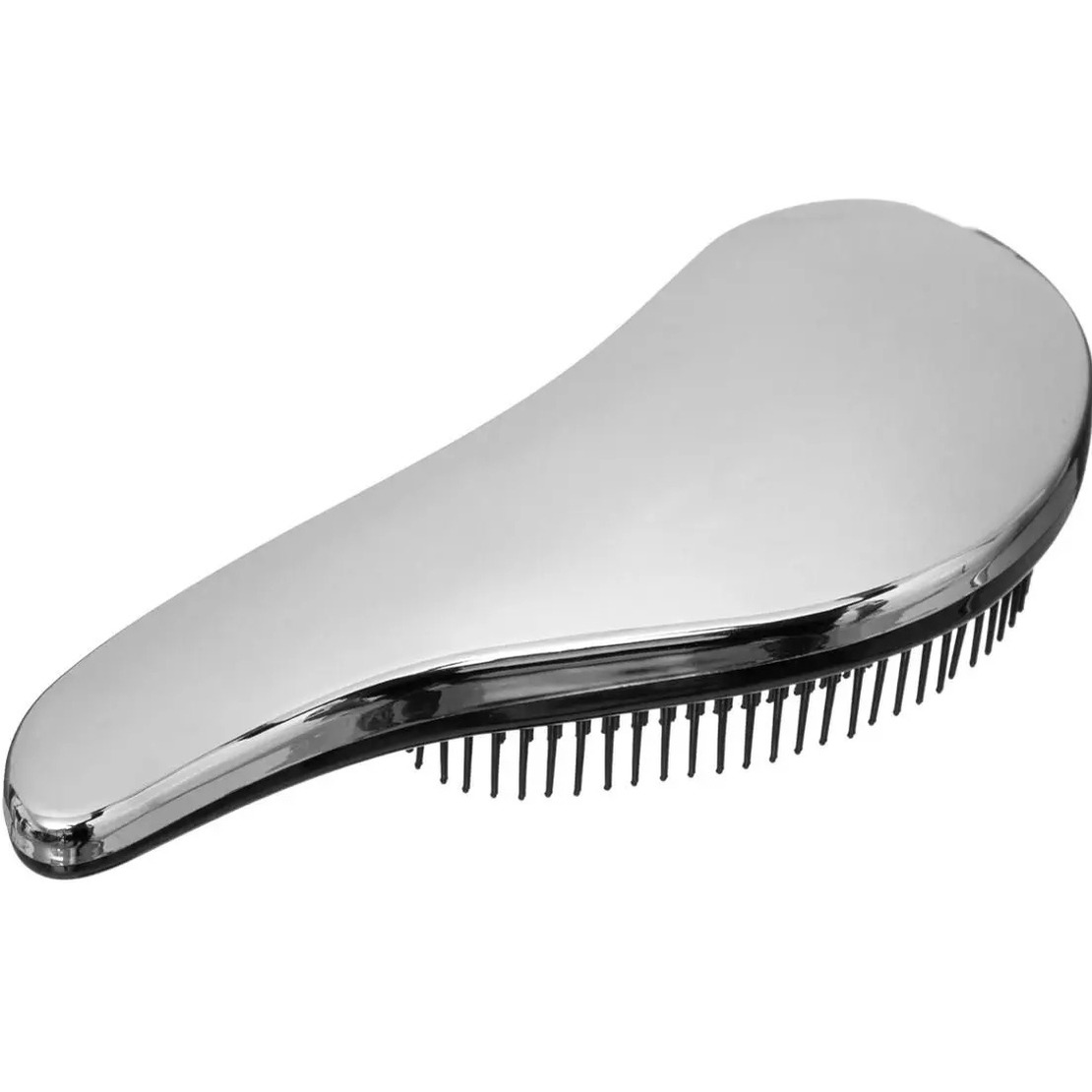 Haarborstel anti-klit zilver 18,5 cm van kunststof. Deze borstel past perfect in elke hand, waardoor borstelen heel makkelijk gaat. Te gebruiken op nat en droog haar. Met flexibele tanden, waardoor klitten pijnloos worden verwijderd. Afmeting: ca. 18,5 x 8 x 3,5 cm. Materiaal: kunststof/rubber.