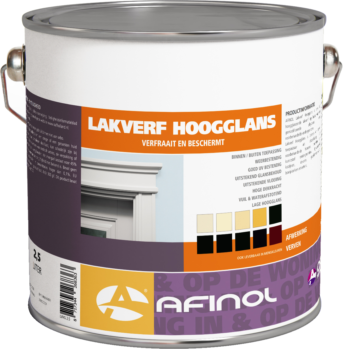 Afinol (OAF) hoogglans lakverf is op basis van een highsolid alkyd. Deze van uitstekende kwaliteit hoogglanzende verf is geschikt voor hout, metaal en kunststof en wordt veel toegepast op kozijnen, deuren, geveltimmerwerk, boeiplanken etc. Geschikt voor zowel binnen als buiten. Deze verf is te bestellen in meer dan 20.000 kleuren.EigenschappenUitstekend glansbehoudUitstekende vloeiingHoge dekkrachtWeinig oplosmiddelenGoede buitenduurzaamheid