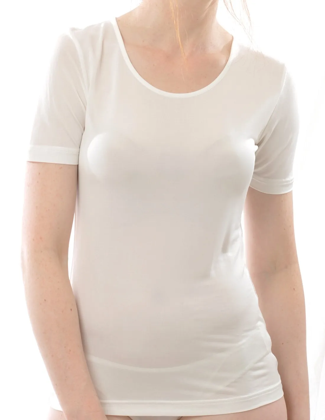 Bekijk product bij Biomoda.nl — bestel vandaag nog en ontvang de Zijden Dames T-Shirt met Ronde Hals Alkena Kleur Gebroken wit Maat Medium snel thuis.