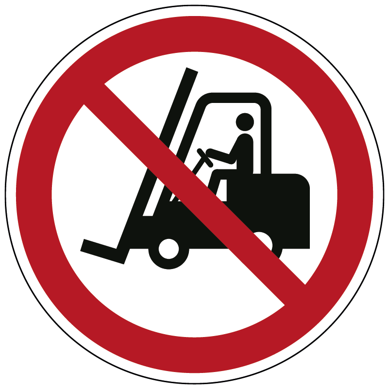 Het pictogram toont een ronde witte achtergrond met rode rand en een diagonale rode streep over een zwart heftrucksymbool, waardoor het verbod direct zichtbaar en begrijpelijk is – ongeacht taal of achtergrond.