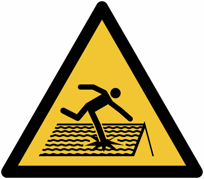 Dit waarschuwingspictogram heeft een gele achtergrond, zwarte rand en een zwart pictogram van een persoon die door een dak zakt, conform ISO 7010 (code W050). Het symbool maakt het risico op instorting of breekbare oppervlakken direct zichtbaar – zonder taal nodig.