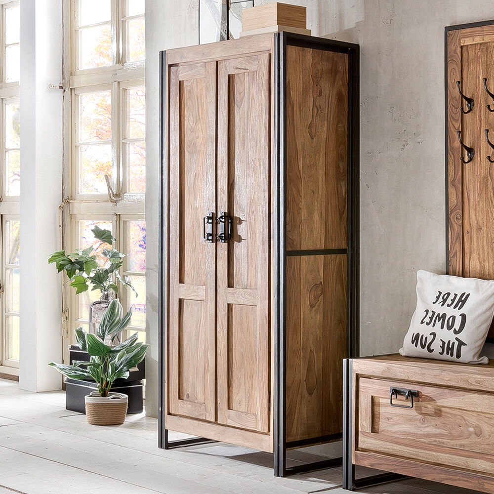 Deze halkast van acaciahout is een aantrekkelijke blikvanger in je woonkamer. Hij scoort met een mix van hout in een warme natuurtint en metalen handgrepen. De materiaalmix van warm hout en stoer metaal is helemaal volgens de trend en zorgt voor interessante contrasten in het uiterlijk. Naast het uiterlijk maakt de kast indruk met zijn tastbare structuur. Hij kan harmonieus worden geïntegreerd in verschillende woonprogramma's. Achter twee deuren met drie legplanken en een losse kledingroede is er veel gesloten opbergruimte voor diverse alledaagse voorwerpen. Zelfs dossiermappen zouden hier een echt stijlvolle plaats krijgen, als deze kast zijn werk deed als kantoorkast. Zorgt voor een huiselijke sfeer: de halkast met een moderne mix van materialen. Elk stuk is uniek.