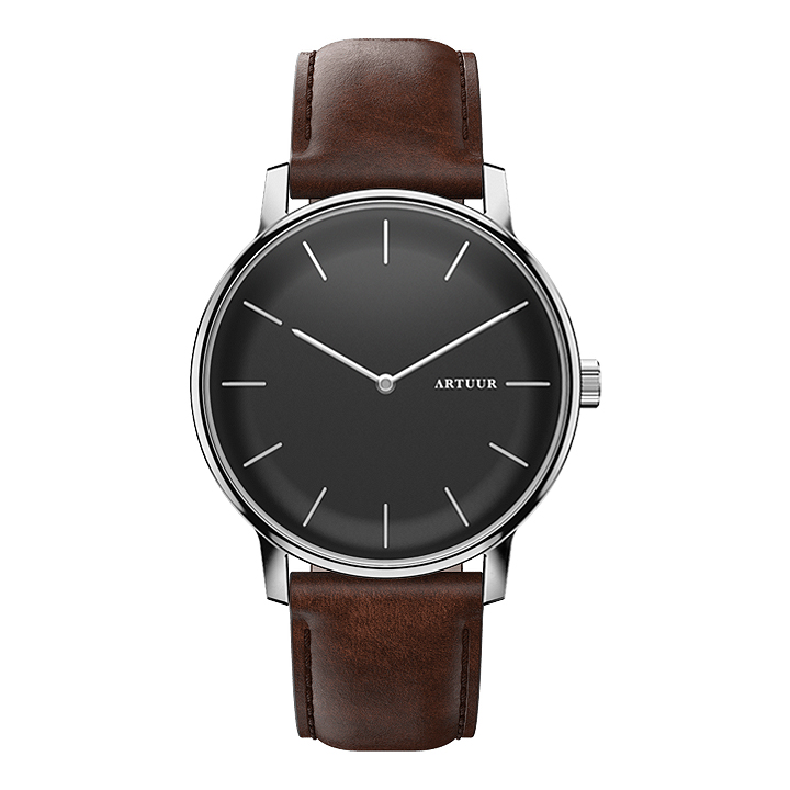 Het bijzondere aan de ARTUUR-horloges is de gebogen wijzerplaat. Daardoor ontstaat bij elke polsbeweging een ander perspectief. De bijzondere vorm valt extra op, omdat de wijzerplaten klassieke kleuren hebben als zwart of wit. De ARTUUR-horloges zijn echte modeaccessoires. Doordat je de bandjes kunt verwisselen pas je het horloge eenvoudig aan bij elke kledingstijl, gelegenheid, stemming of seizoen. Van zakenmensen tot studenten en van artistiekelingen tot senioren: voor iedereen is er een geschikte ARTUUR. Het Sterling horloge heeft een zilverkleurige metalen kast met een zwarte wijzerplaat. Door de zilverkleurige uurstrepen heeft het horloge een mooie klassieke uitstraling. De donkerbruine band is gemaakt van echt leer.