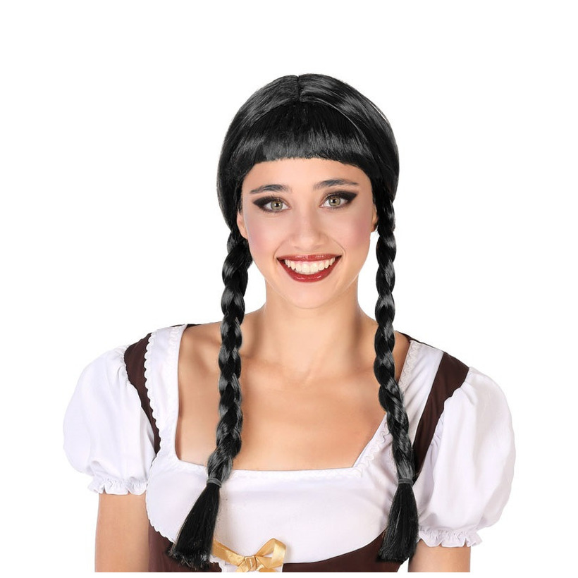 Verkleedpruik voor dames met lang haar met 2 vlechtjes in de kleur Zwart. Damespruik met specifieke haardracht. Geschikt voor Carnaval en andere thema party/feesten. Eenvoudig op te zetten. Blijft beter zitten met een haarnetje(hebben wij ook beschikbaar). Voordelige feestpruiken voor vrouwen.