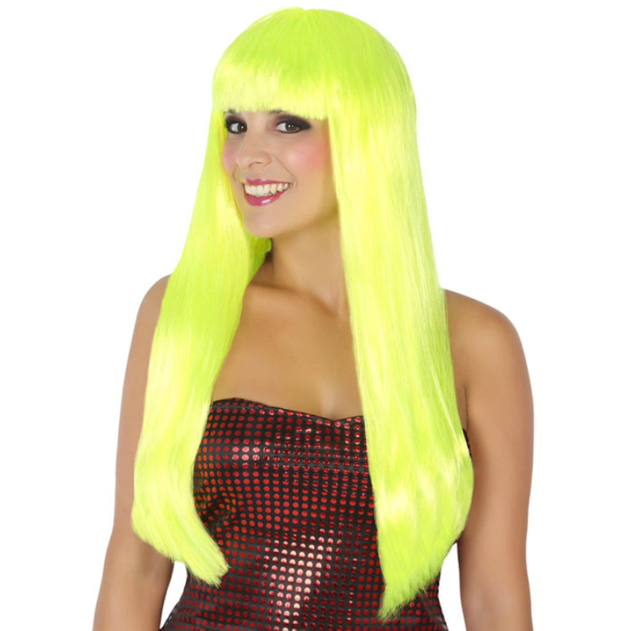 Verkleedpruik voor dames met lang stijl recht haar in de kleur Geel. Damespruik met stijlvol kapsel. Geschikt voor Carnaval en andere thema parties/feesten. Eenvoudig op te zetten. Blijft beter zitten met een haarnetje(hebben wij ook beschikbaar). Voordelige feestpruiken voor vrouwen.