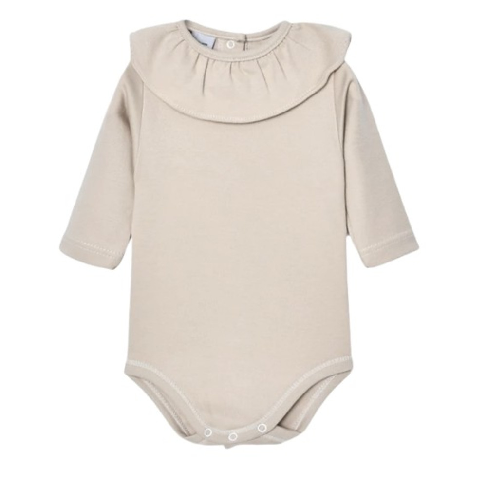 Zandkleurige romper met grote kraag van Babidu. Te combineren onder een vestje, jurkje enz.