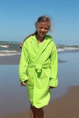 Met deze lime groene kinderbadjas geef je je kind een warm gevoel! Met gave capuchon, van 100% velours katoen en fijn badstof van binnen: jongens en meisjes tot 14 jaar zijn hierin direct droog en direct op hun gemak. Met gave borduurmogelijkheid!