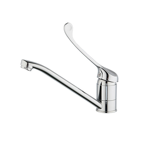 Chroom kraan met een extra lange bedieningshendel voor een hygiënisch gebruik van de kraan.