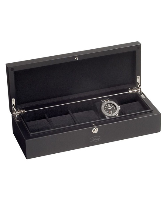 Beco Technic Castle Matzwarte horlogekist voor 5 horloges, met een diameter tot 56 mm. Een topkwaliteit horlogekist, in een strakke vormgeving, voor de echte liefhebber of horlogeverzamelaar. Materiaal: massief hout, van binnen zwart fluweel. Uitgevoerd met edelstalen scharnieren. Kleur: zwart, zijdemat gelakt Sluiting: afsluitbaar met stevige drukknopsluiting Afmetingen: 340 x 128 x 80 mm Gewicht: 1,2 kg