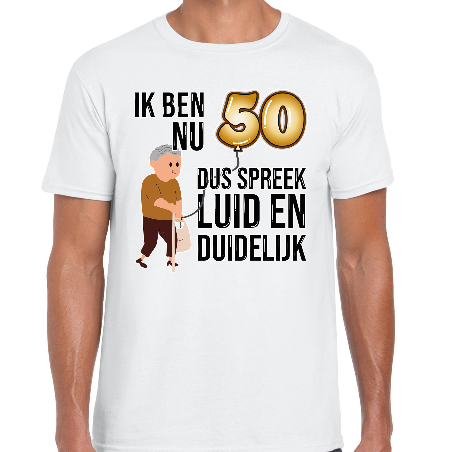 Bekijk product bij Fun-en-feest.nl — bestel vandaag nog en ontvang de BD Cadeau T-shirt heren – leeftijd 50 jaar – wit – luid en duidelijk snel thuis.