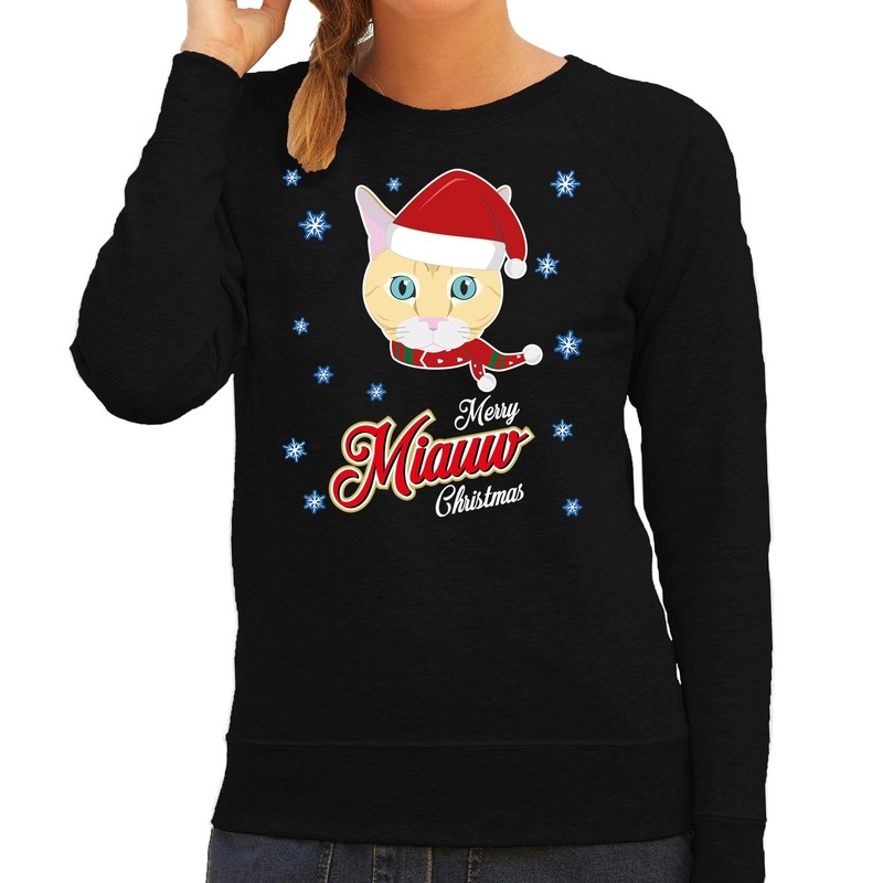 Foute Kersttrui Merry Miauw Christmas Kerst kat, in de kleur zwart, voor dames. Deze leuke Kerst trui / sweater is bedrukt met een kat / poes met kerstmuts en de tekst: Merry Miauw Christmas. Deze kersttrui / sweater / sweatshirt is van dun ongeborsteld katoen en heeft raglan mouwen. Het is dus geen dikke warme trui en kan prima gedragen worden op een kerstborrel of bij het gourmetten.
