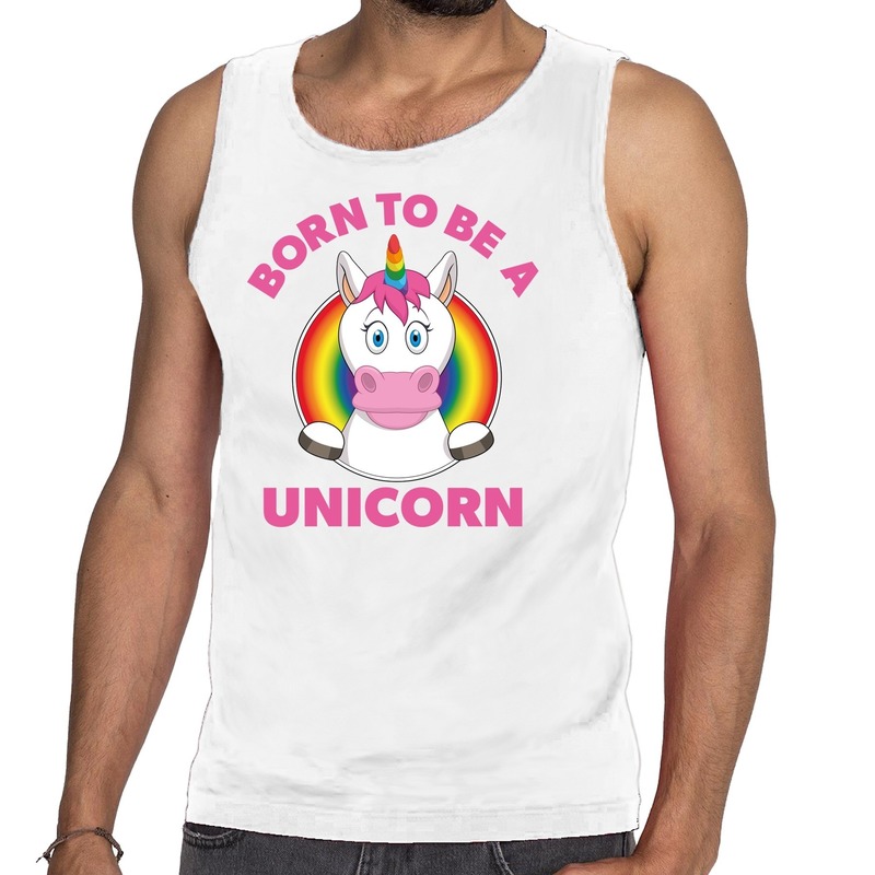 Born to be a unicorn gay pride tanktop/mouwloos shirt in het wit voor heren. Dit witte LGBT shirt heeft een roze born te be a unicorn bedrukking met de afbeelding van een eenhoorn omringd door een regenboog. Materiaal: 100% katoen 150 grams kwaliteit. Gay pride kleding.