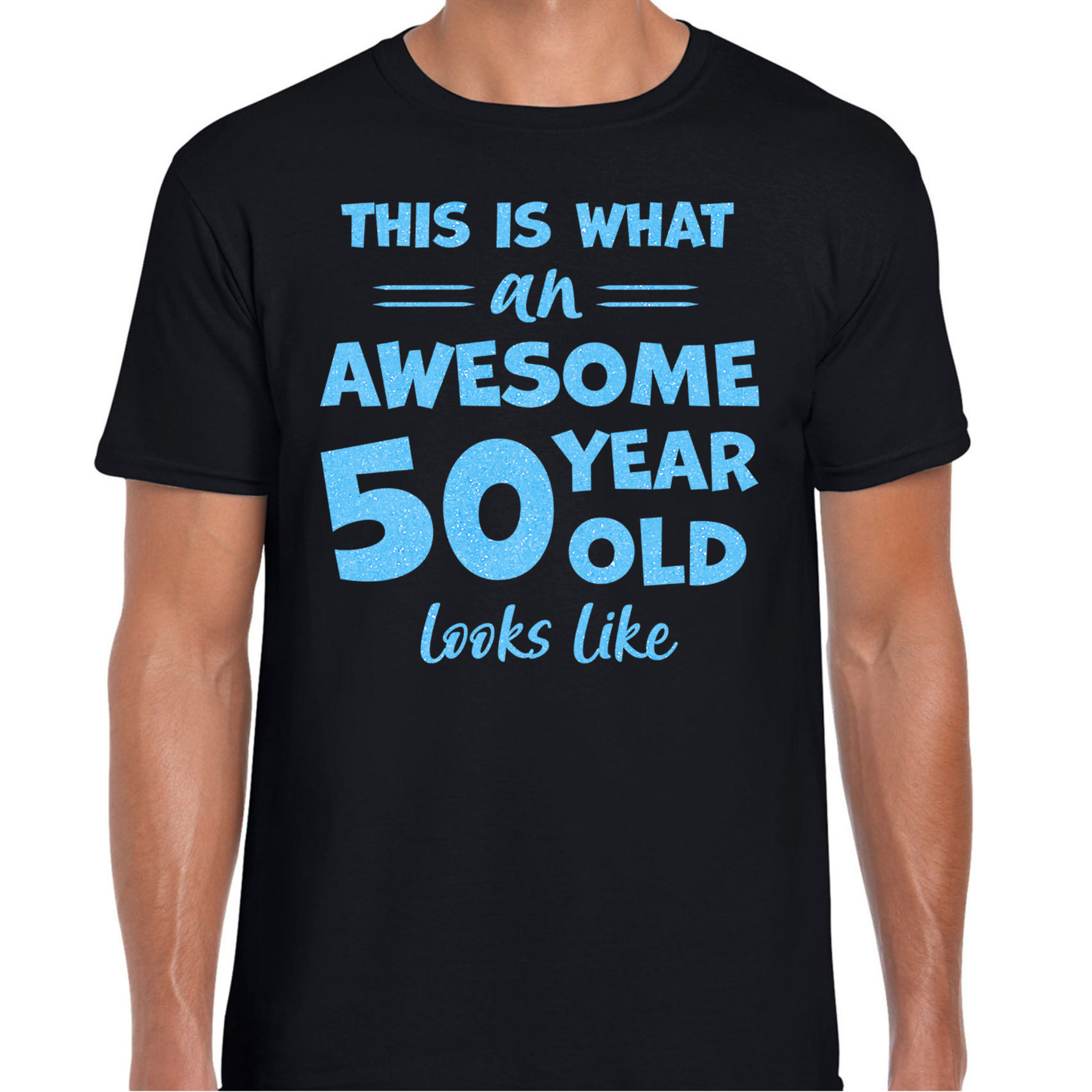 Cadeau T-shirt voor heren – leeftijd 50 jaar – awesome – zwart – glitter blauw – Abraham — Bellatio Decorations