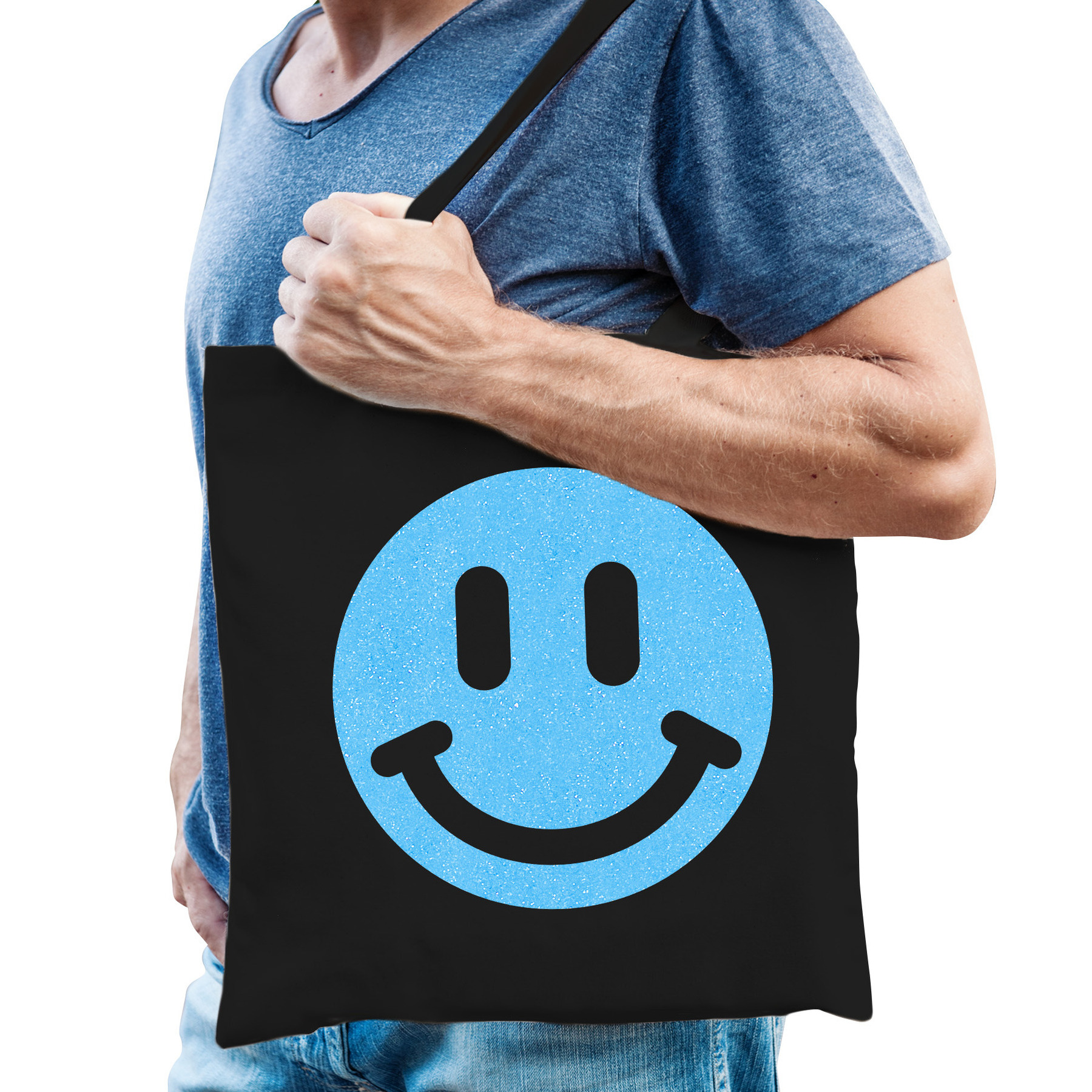 Bekijk product bij Bellatio.nl — bestel vandaag nog en ontvang de Cadeau tas voor heren – glitter Smile Emoticon – zwart – katoen – 42 x 38 cm – Vaderdag – verjaardag – snel thuis.