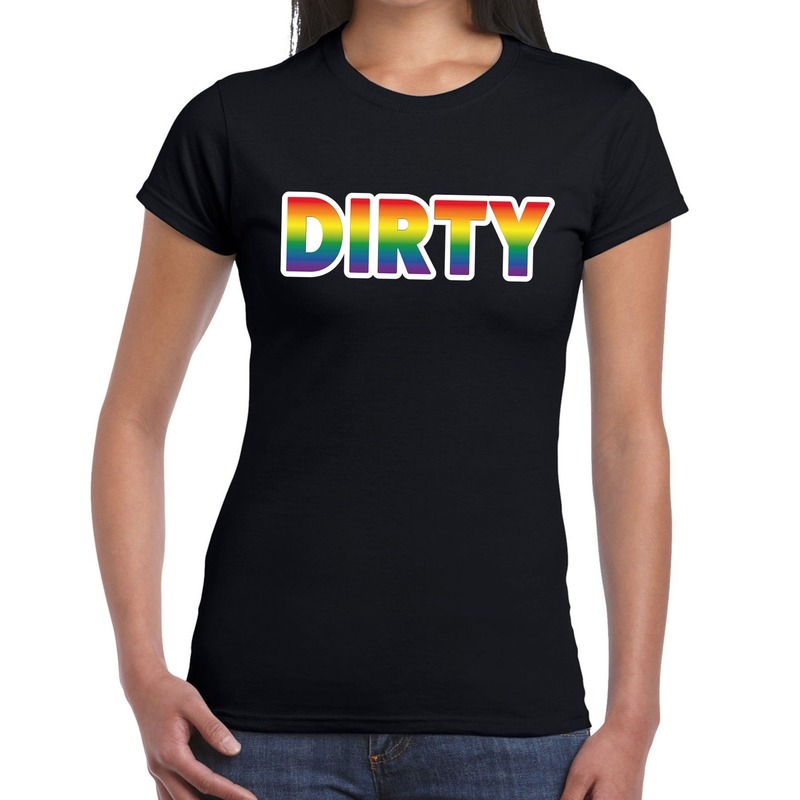Dirty gay pride t-shirt zwart voor dames. Dit zwarte LGBT shirt heeft een Dirty bedrukking in regenboog kleuren. Materiaal: 100% katoen 150 grams kwaliteit. Gay pride kleding.