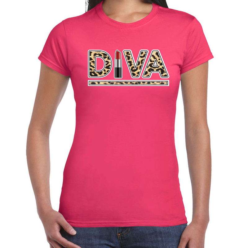 Diva lipstick fun tekst t-shirt voor dames roze met panter print — Bellatio Decorations