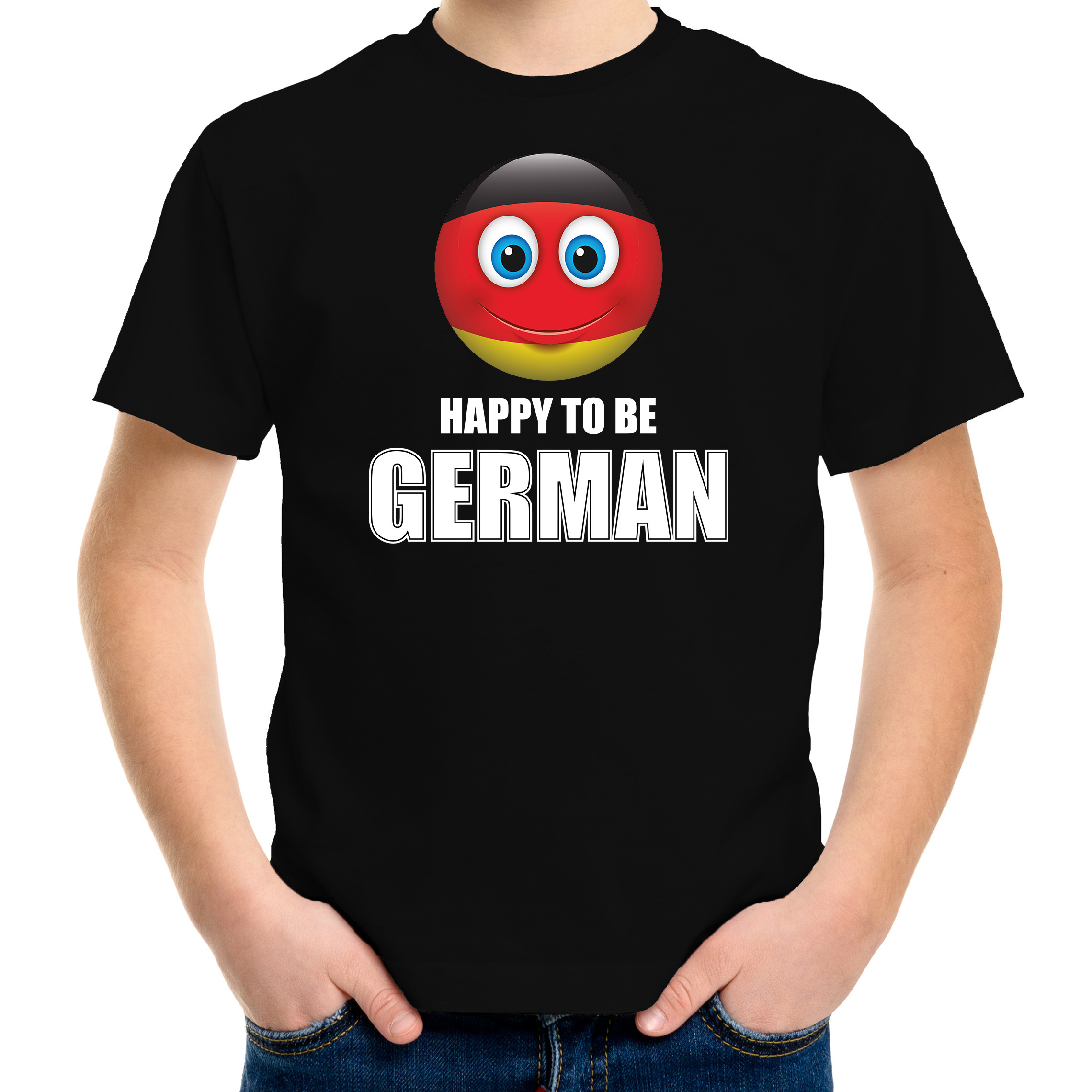 Bekijk product bij Bellatio.nl — bestel vandaag nog en ontvang de Duitsland Emoticon Happy to be German landen t-shirt zwart kinderen snel thuis.