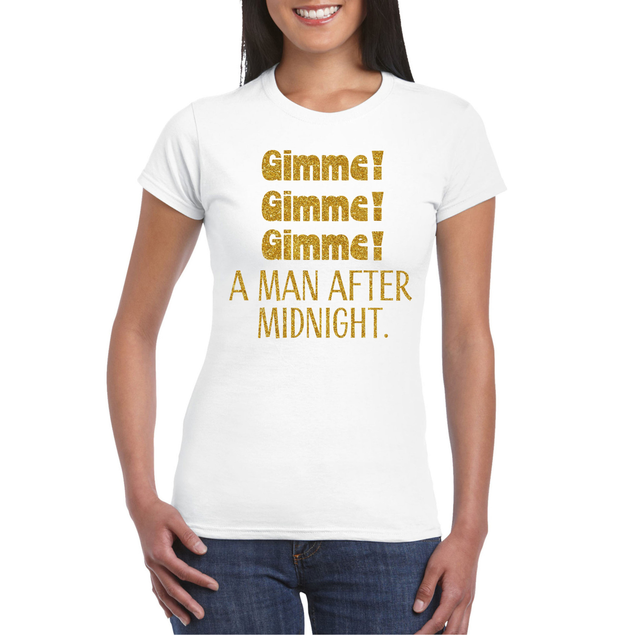 Foute Party T-shirt voor dames – gimme gimme – wit – glitter – vrijgezellenfeest – carnaval — Bellatio Decorations