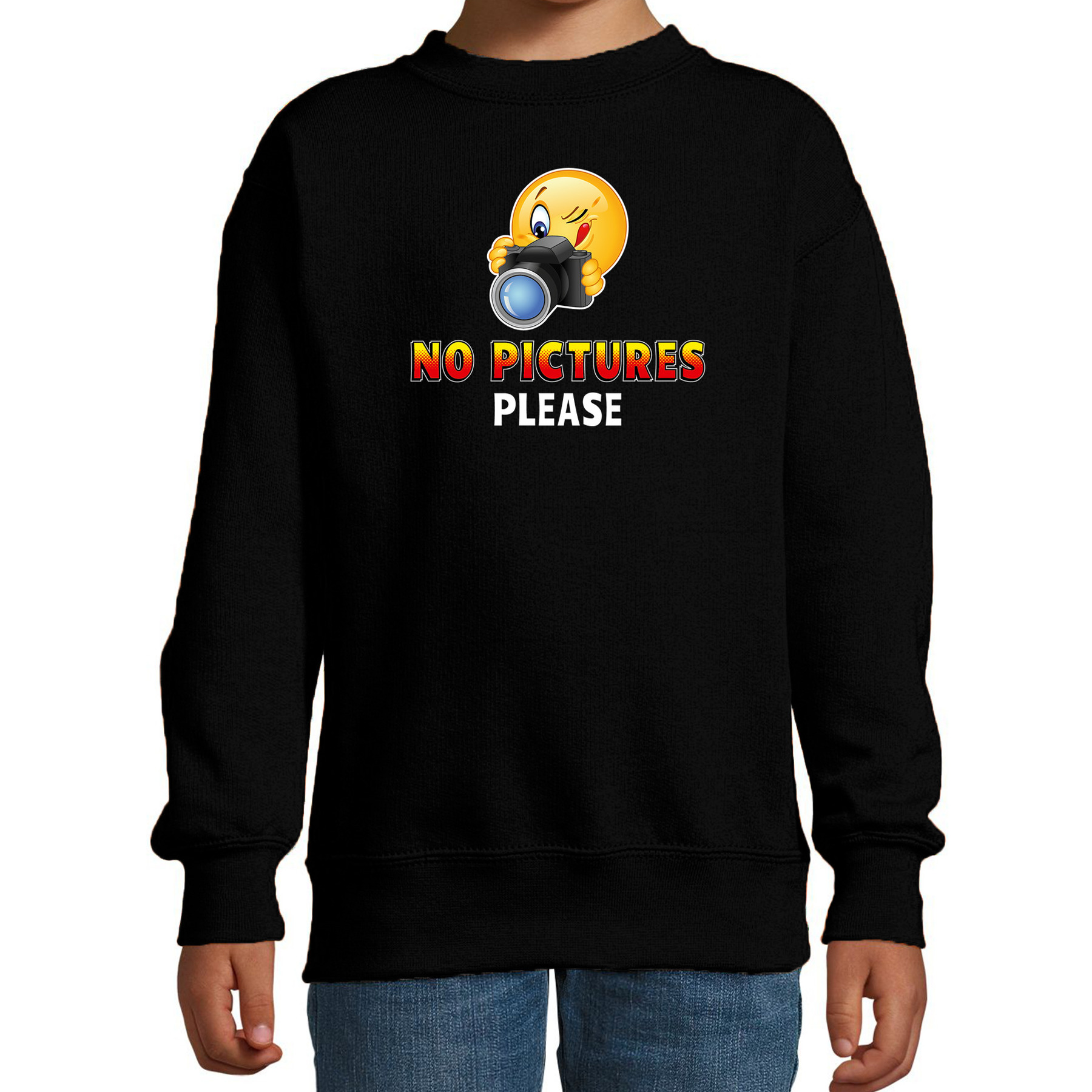 Bekijk product bij Bellatio.nl — bestel vandaag nog en ontvang de Funny emoticon sweater No pictures please zwart kids 14-15 jaar (170/176) – snel thuis.