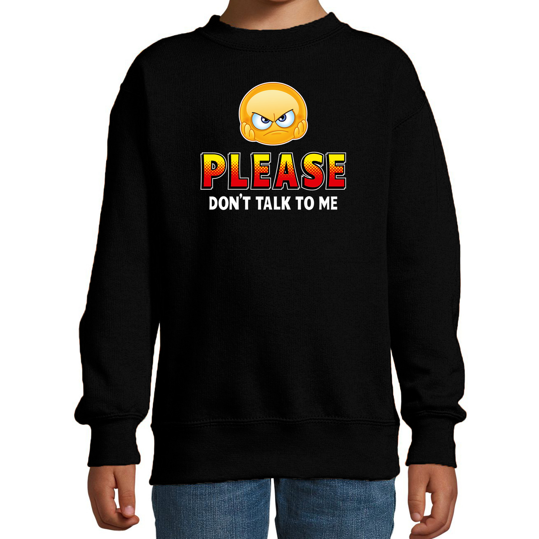 Bekijk product bij Bellatio.nl — bestel vandaag nog en ontvang de Funny emoticon sweater Please dont talk to me zwart kids 9-11 jaar (134/146) – snel thuis.