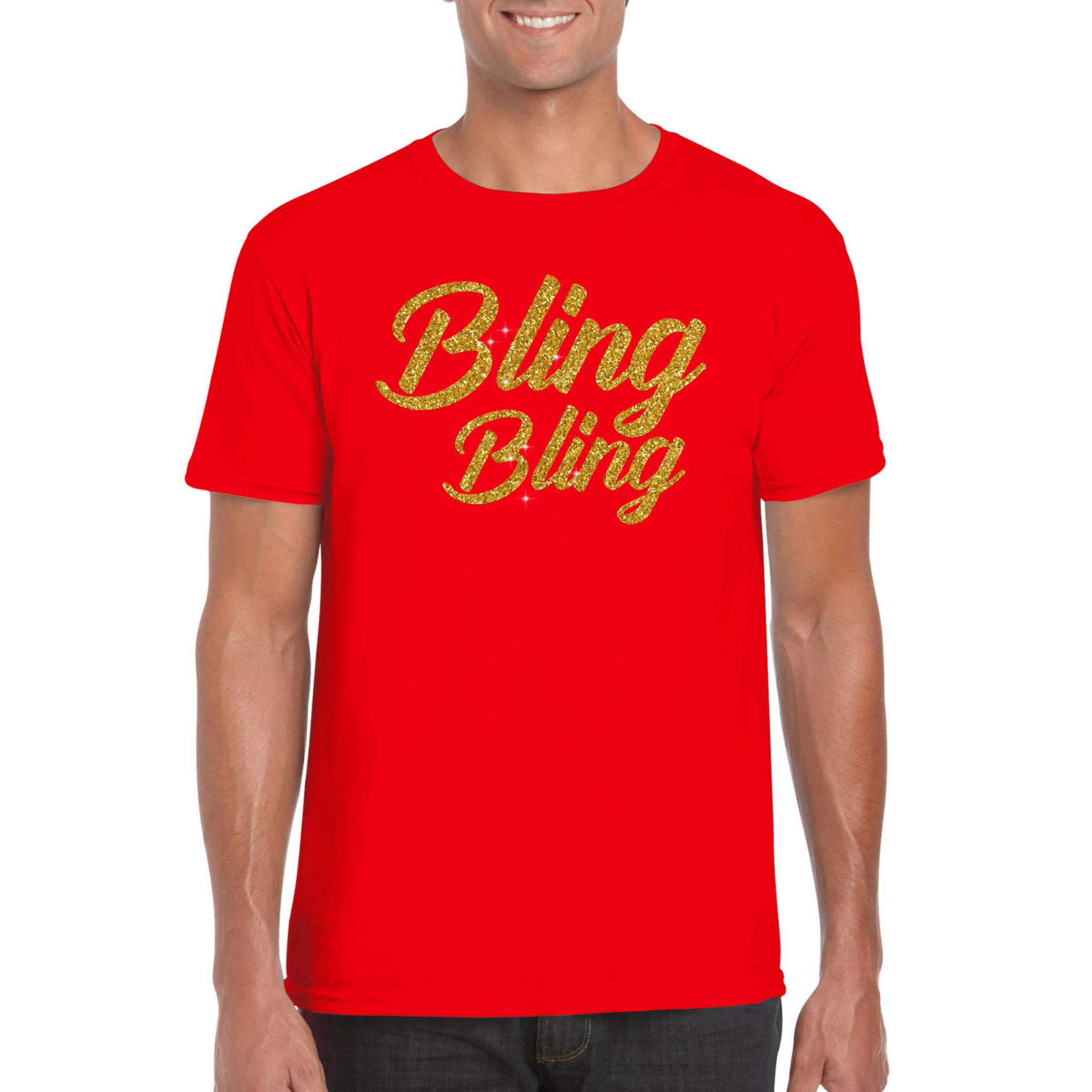 Glitter en Glamour feest t-shirt rood voor heren. Op dit shirt staat in goudkleurige glitter bedrukking de tekst: Bling bling. Leuk party t-shirt met goud kleur glitter tekst om te dragen tijdens een Meer info →