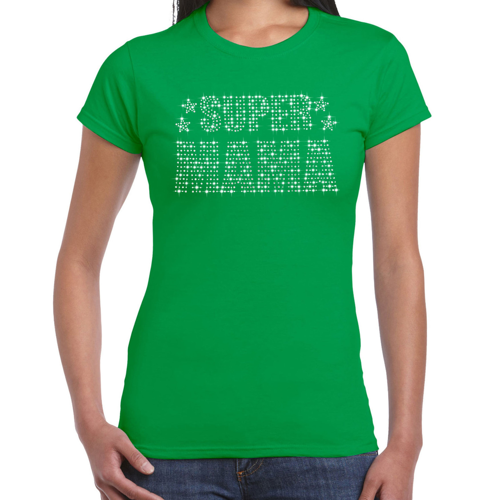 Glitter Moederdag t-shirt groen Super Mama met rhinestones steentjes voor dames. Op dit groene shirt staat een bedrukking van zilveren rhinestones steentjes met de tekst Super Mama. Heb jij een glitter & glamour mama? Dan is dit echt iets voor haar. Geef dit leuke shirt cadeau voor Moederdag, haar verjaardag of gewoon zomaar.