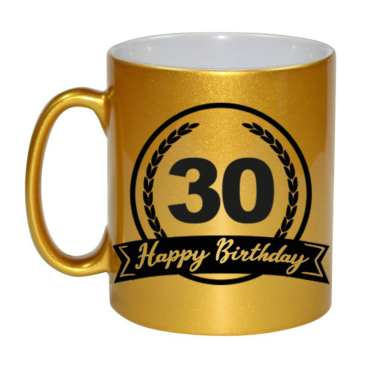 Bekijk product bij Kado-versturen.nl — bestel vandaag nog en ontvang de Happy Birthday 30 years gouden cadeau mok / beker met wimpel 330 ml snel thuis.
