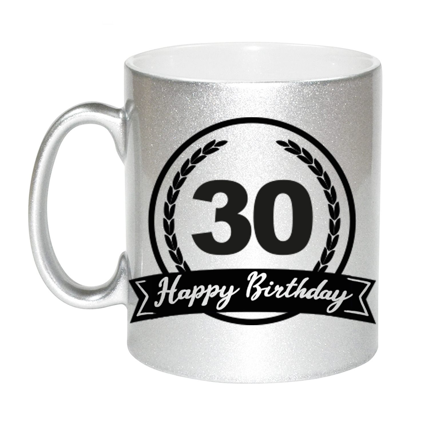 Bekijk product bij Kado-versturen.nl — bestel vandaag nog en ontvang de Happy Birthday 30 years zilveren cadeau mok / beker met wimpel 330 ml snel thuis.