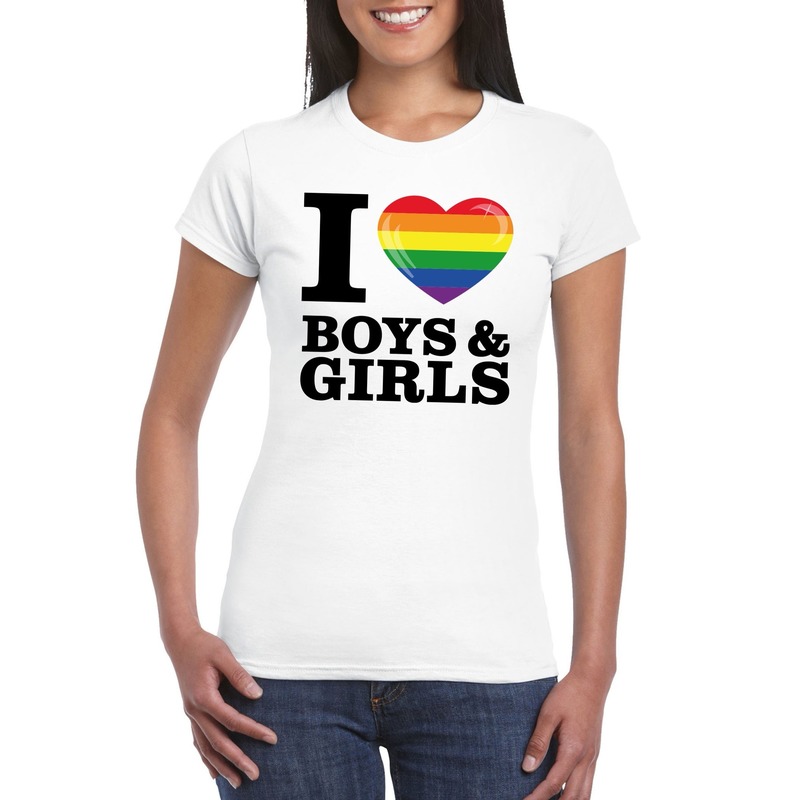 Bekijk product bij Gay-pride-winkel.nl — bestel vandaag nog en ontvang de I love boys & girls regenboog t-shirt wit dames snel thuis.