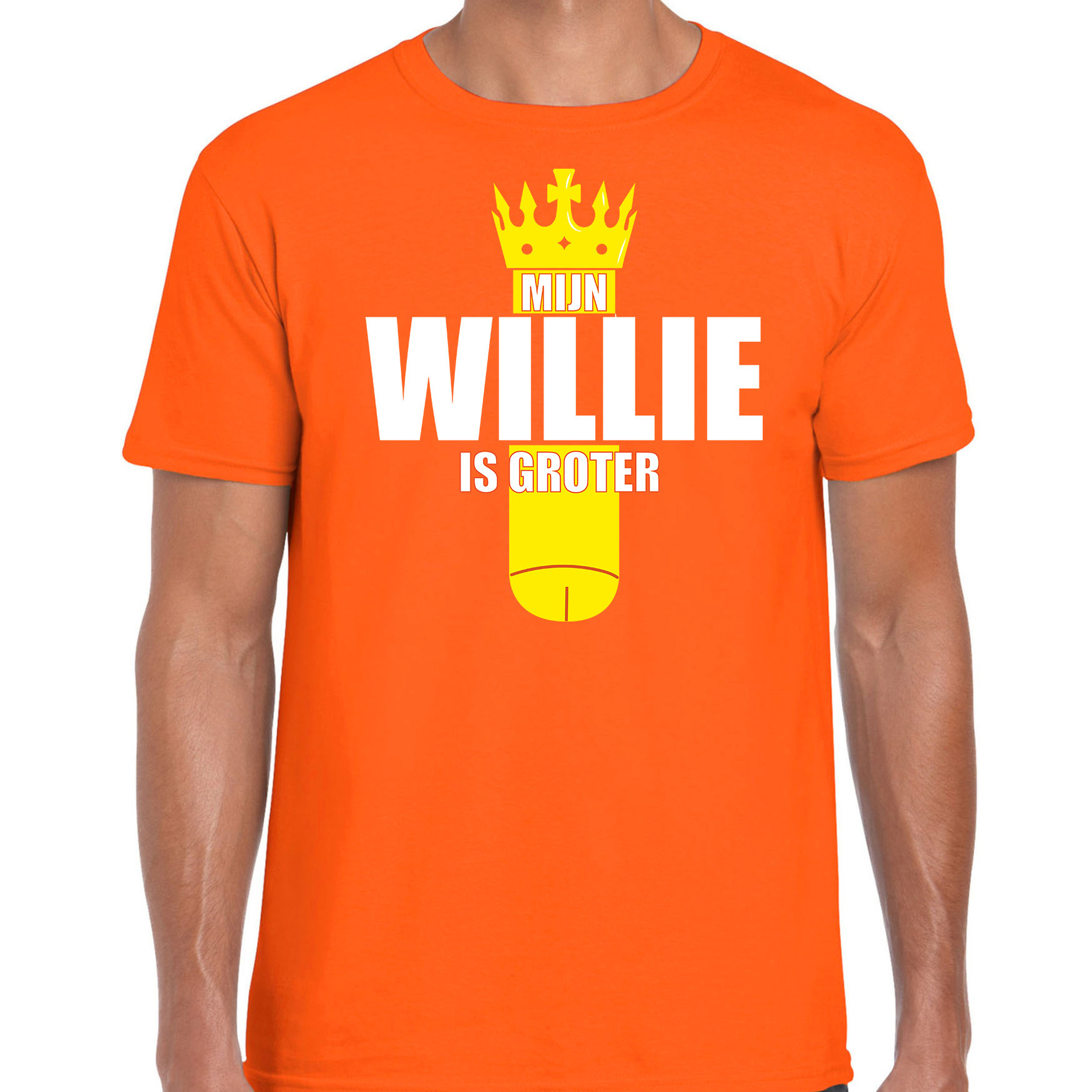 Bekijk product bij Carnavalskostuumwinkel.nl — bestel vandaag nog en ontvang de Koningsdag t-shirt mijn Willie is groter met kroontje oranje voor heren snel thuis.