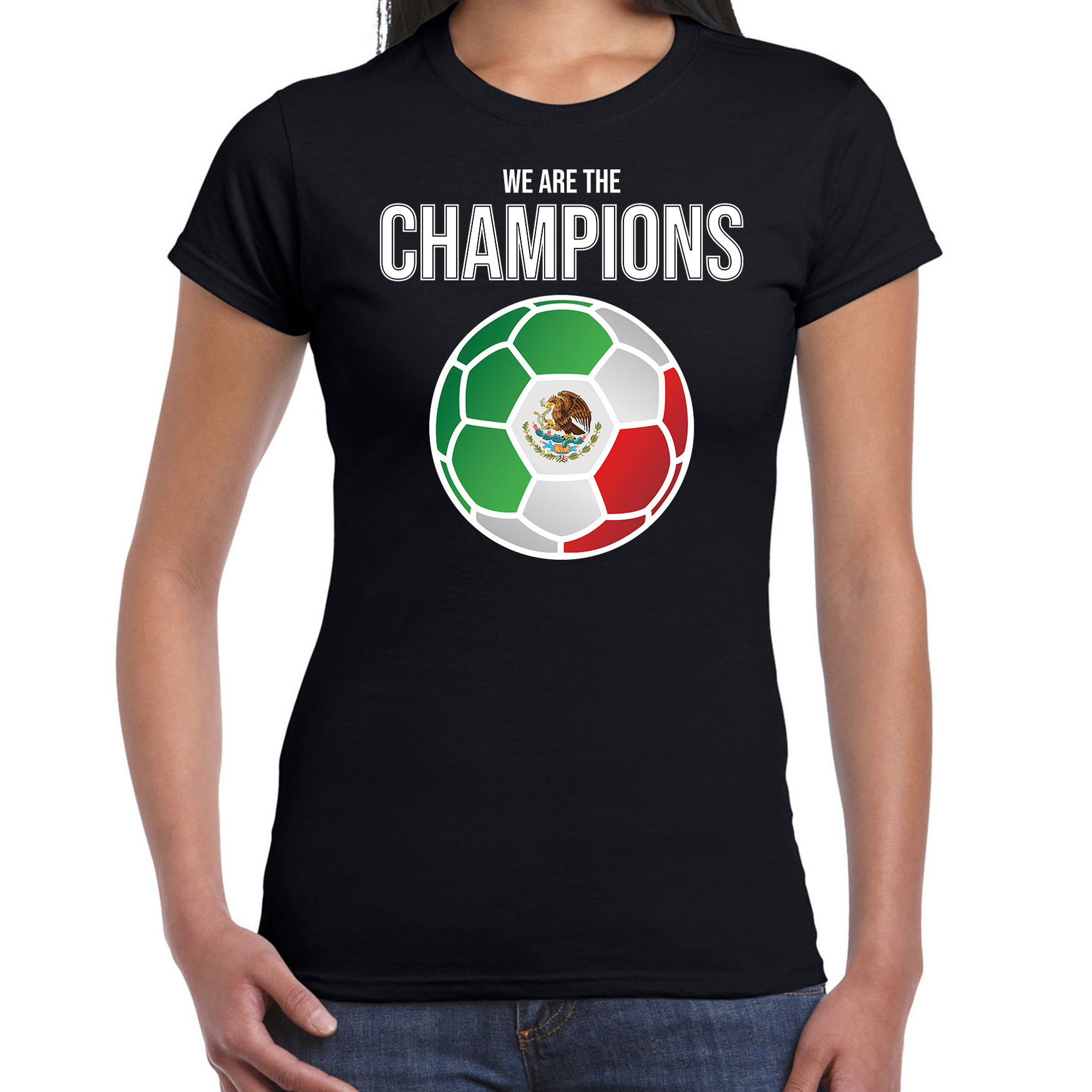 Mexico WK supporter t-shirt we are the champions met Mexicaanse voetbal zwart dames — Bellatio Decorations