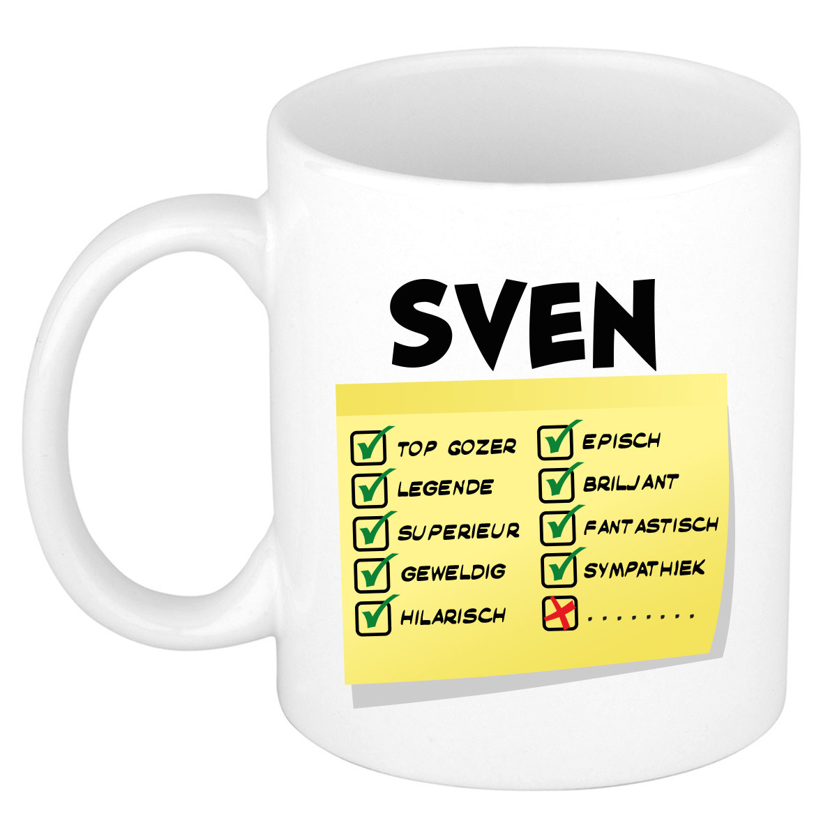 Bekijk product bij Knuffelparadijs.nl — bestel vandaag nog en ontvang de Naam mok Sven – wit – top gozer – keramiek – 300 ml – cadeau collega beker snel thuis.