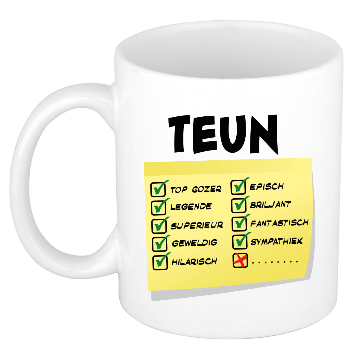 Bekijk product bij Knuffelparadijs.nl — bestel vandaag nog en ontvang de Naam mok Teun – wit – top gozer – keramiek – 300 ml – cadeau collega beker snel thuis.