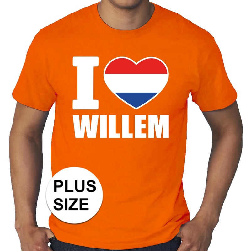 Oranje I love Willem shirt grote maten voor heren. Op dit shirt staat groot I hartje Willem. Materiaal: 145 grams, 100% katoen. Koningsdag kleding of oranje fan/ supporter kleding.