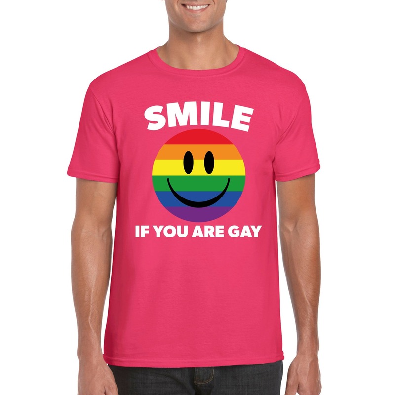 Bekijk product bij Gay-pride-winkel.nl — bestel vandaag nog en ontvang de Smile if you are gay emoticon shirt roze heren snel thuis.