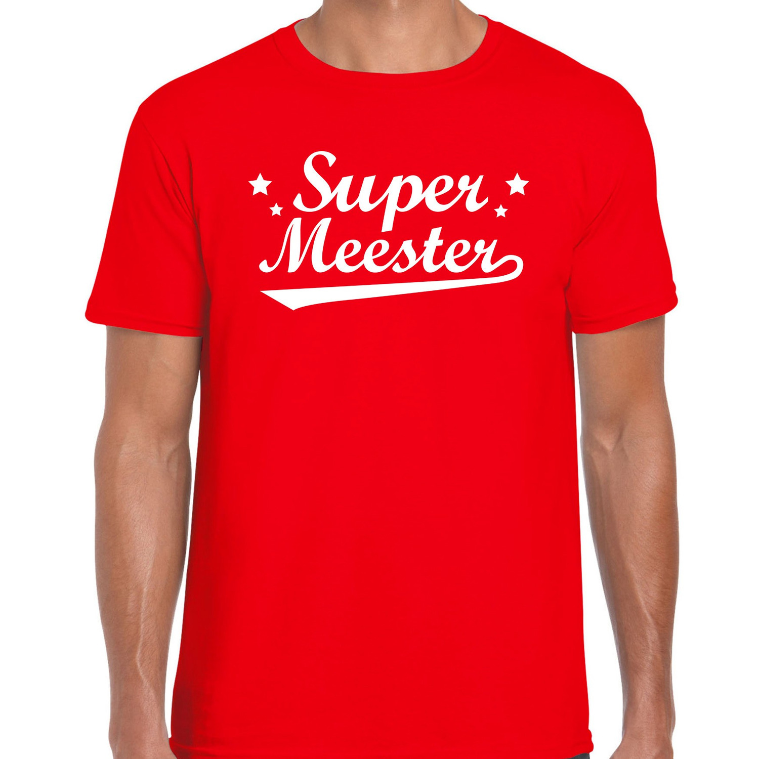 Super meester cadeau t-shirt rood heren. Op dit rode shirt staat in sierlijke letters de tekst Super meester. Leuk om aan je meester/docent te geven na bijvoobeeld een schooljaar. Materiaal: 150 grams, 100% katoen.
