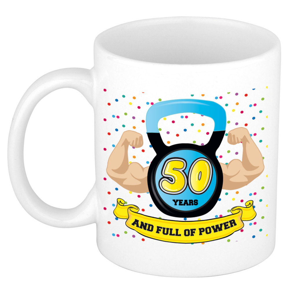 Verjaardag cadeau mok 50 jaar – blauw – spieren – 300 ml – keramiek – Abraham — Bellatio Decorations
