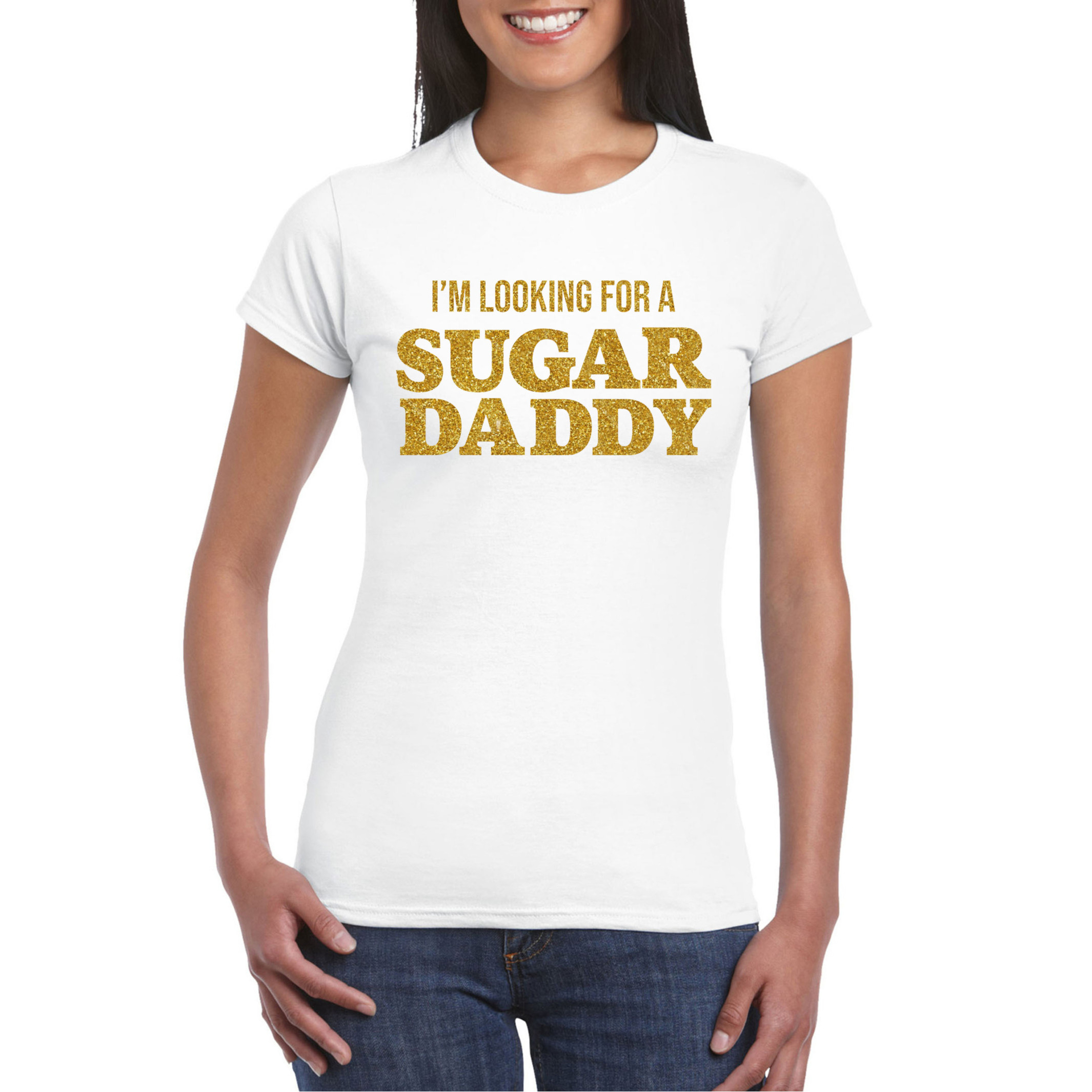 Verkleed T-shirt voor dames in de kleur wit met glitter opdruk in de kleur goud. Dit leuke T-shirt is bedrukt met de tekst: I’m looking for a Sugar Daddy. Heb jij binnenkort een foute party, carnaval of een ander glitter en glamour feestje? Dan is dit T-shirt onmisbaar! Het shirt is ook leuk om cadeau te geven of te dragen tijdens het uitgaan/stappen. Materiaal: 145 grams, 100% katoen. Merk: Bellatio Decorations.