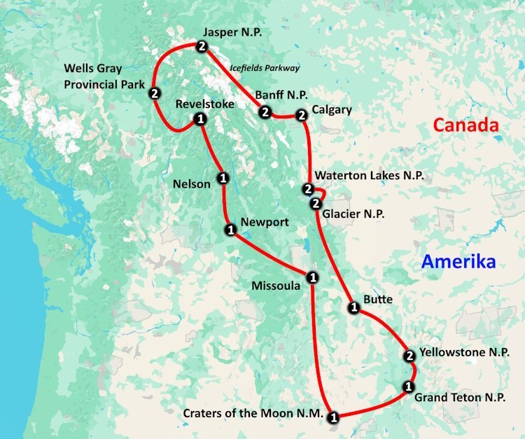 In Calgary haalt u de camper op en rijdt u direct naar de ruige schoonheid van Waterton Lakes National Park, waar kristalheldere meren en imposante bergketens elkaar ontmoeten. De reis gaat verder naar Glacier National Park, waar gletsjers en dramatische bergtoppen de horizon domineren. Yellowstone National Park biedt vervolgens een spectaculaire natuurervaring met zijn borrelende geisers en de indrukwekkende Grand Canyon van Yellowstone. Na het verkennen van het vulkanische landschap van Craters of the Moon en de charmante dorpjes in de Kootenays, wordt de route afgesloten in de beroemde Canadese Rockies, waar de iconische parken Jasper en Banff op u wachten met hun ongerepte wildernis en adembenemende uitzichten.