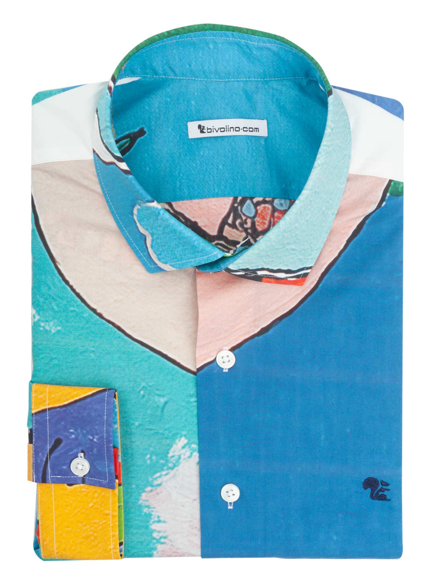 Overhemd in print van schilderwerk Jan Latinne Jan Latinne is een Belgisch veelzijdig kunstenaar. Naast schilderijen, zeefdrukken en tekeningen maakt hij ook glasvezelsculpturen. Eind jaren 70 stond hij met Rik Hamblok en Humberto Wouters aan de wieg van ASIKAN 2240, een “international Art Group”. Deze groep ontstond als een reactie tegen de ingeslapen, uitgedoofde en vervlakte samenleving. De kunstenaars wilden niet geleefd worden, maar via hun kunstwerken tonen hoe het leven echt kon zijn. Latinne onderhield veel contact met Herman Brood. Zo waren er in 2000 en 2001 exposities met werken van beide kunstenaars. In het werk van Jan Latinne worden we geconfronteerd met een carroussel aan kleur, spel en beweging waarin we zelf de weg moeten zoeken naar de emotie van de kunstenaar. Zijn werken stralen een vreugde en enthousiasme uit. Latinne exposeert sinds 1969 in binnen- en buitenland (vooral Nederland, Duitsland, Frankrijk, Verenigde Staten). In 2001 verscheen de monografie De vreugde van het scheppen van de vreugde met een biografie en een uitgebreid overzicht van zijn oeuvre