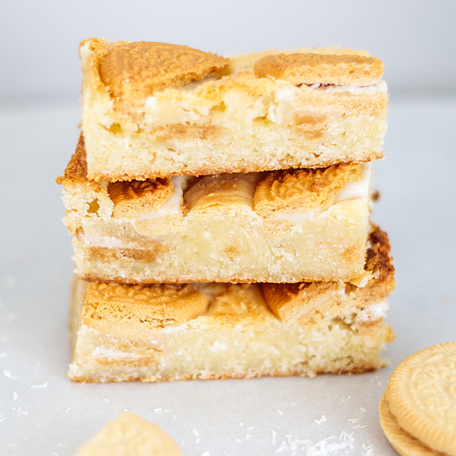 Blondie Kokos Oreo Brownie – 6 Brownies Per Post – Brievenbus Pakket – Box Brownies – Witte chocolade – Geschaafde kokos – Oreo golden koekjes — Boxbrownies.nl