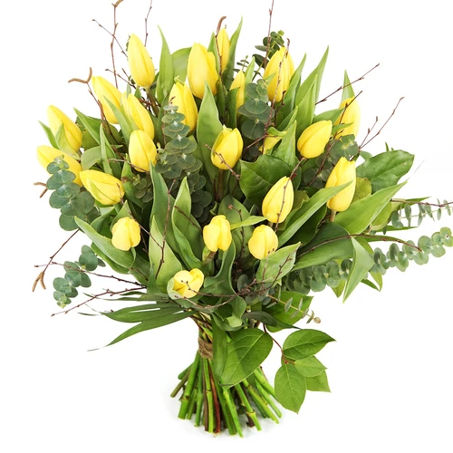 Gele tulpen gebonden tot één rond boeket, Vandaag gele tulpen bestellen is binnen 24 uur bezorgd. Thuiswinkel Lid.
