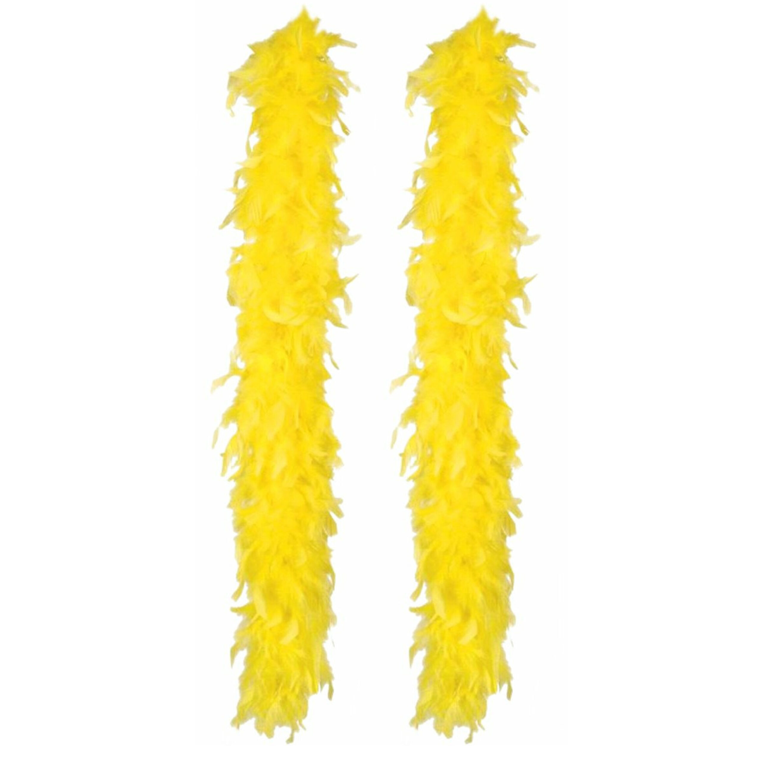 2x carnaval verkleed veren boa van brandvertragend materiaal. Kleur: geel. Lengte: 180 cm. Kwaliteit: 80 grams, extra veel volume, veel meer dan de 50 gram variant. Verkleed accessoires voor dames. Geschikt voor thema’s: VIP, Glitter and Glamour, Roaring Twenties, Popster, Filmster, voor in de kerstboom.