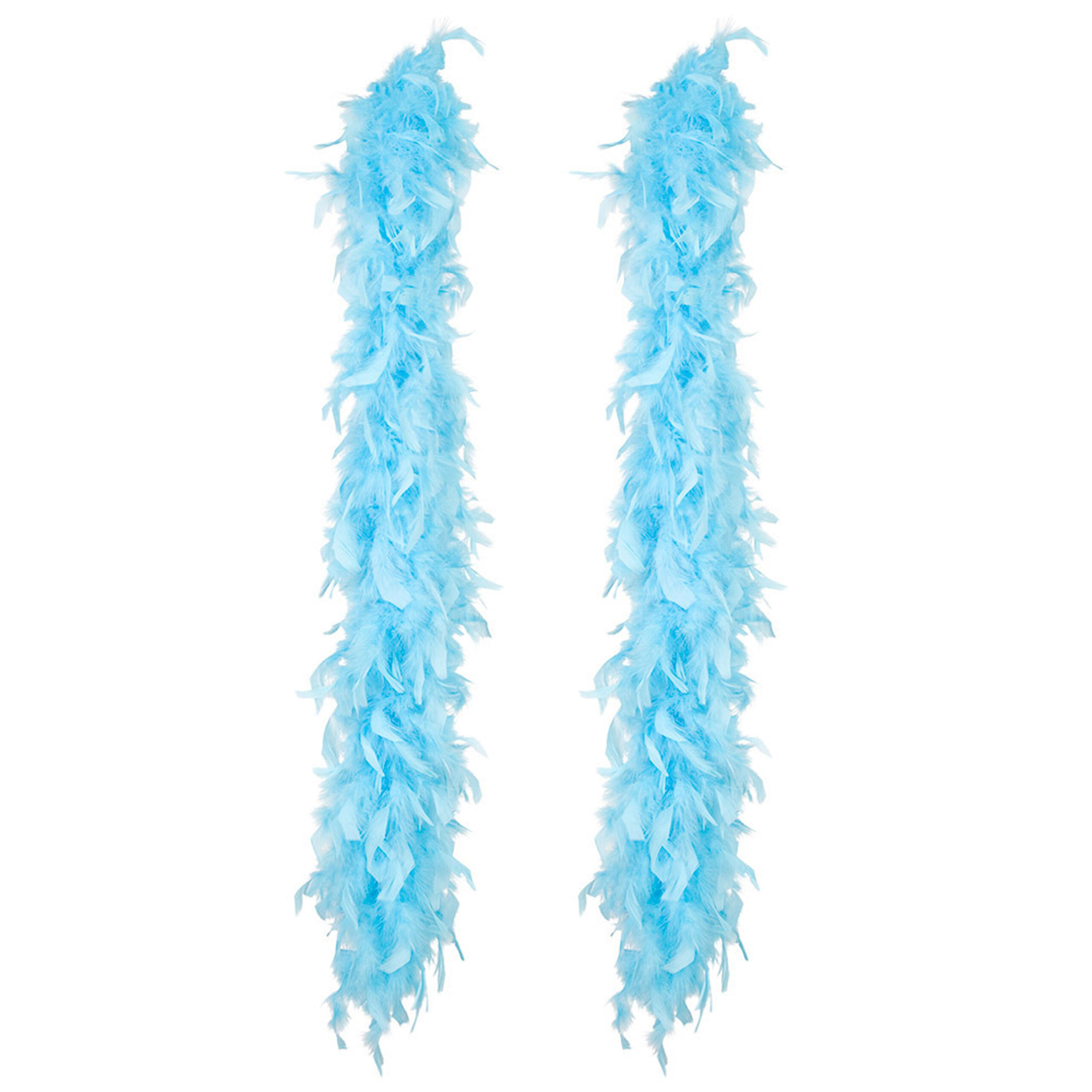 2x carnaval verkleed veren boa van brandvertragend materiaal. Kleur: turquoise blauw. Lengte: 180 cm. Kwaliteit: 50 grams. Verkleed accessoires voor dames. Geschikt voor thema’s: VIP, Glitter and Glamour, Roaring Twenties, Popster, Filmster, voor in de kerstboom.