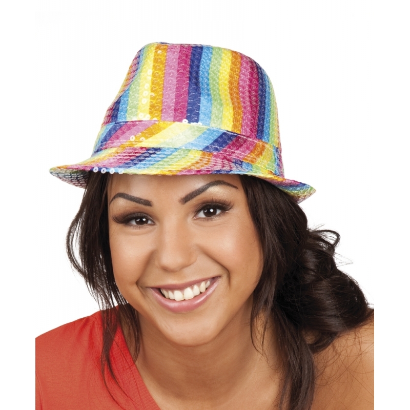 Boland trilby hoed met pailletten. De ideale accessoire voor een themafeest, carnaval of de toppers. one size, voor dames en heren. Deze kleurrijke hoed past bij iedere verkleedoutfit en ieder feest thema! Afmeting: ca. 32 x 12 x 22 cm. Materiaal: 90% polyester en 10% pet. Let op: dit is een verkleedaccessoire voor volwassenen, geen speelgoed.