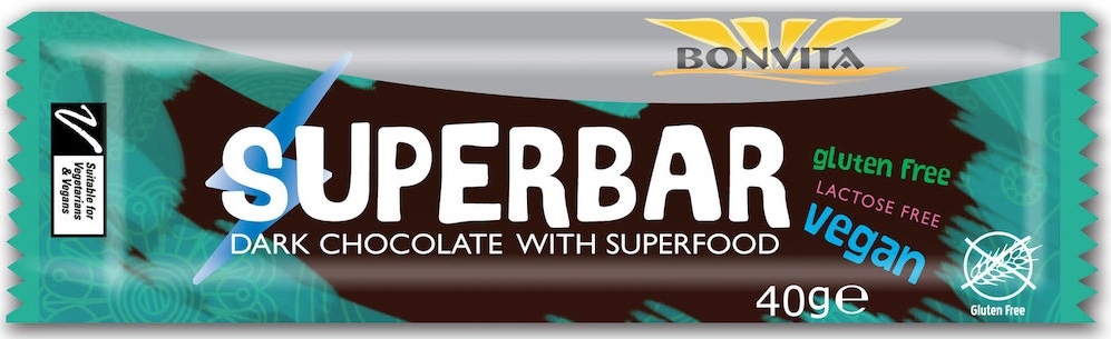 BonVita Superbar 40 gram Een voedzame gluten- en lactosevrije, vegan reep met superfoods omhuld met een laag pure chocolade. Heerlijk als tussendoortje. Meer info →