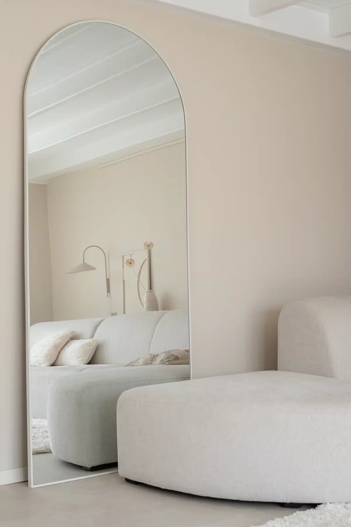 Deze grote boogspiegel uit de Maj collectie is met haar ronding aan de bovenzijde een rustig element. Met afmetingen van 210×90 cm, een ideale spiegel voor in de woonkamer, slaapkamer, kleedkamer of hal.