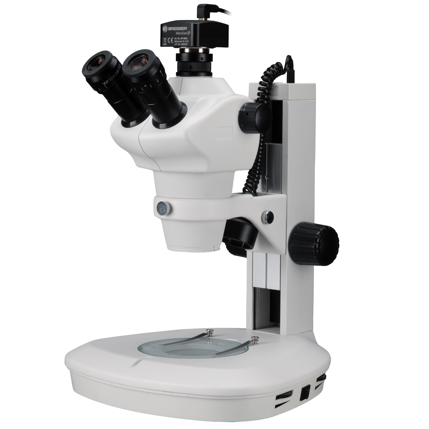 De bijzonder breed uitgevoerde voet met objecttafel en het uitzonderlijk grote hoogteverstelbereik maken ook de observatie van grotere objecten mogelijk. Het instrument beschikt over een LED oplicht- en doorlichtverlichting, die afzonderlijk of gecombineerd kunnen worden gebruikt en elk traploos regelbaar zijn. De invalshoek van het oplicht is bijzonder gebruiksvriendelijk verstelbaar en vergrendelbaar. Met verwisselbare groothoekoculairs (WF10x) en een 6,25-voudige stereo-zoomlens (0,8x-5x) wordt een continu vergrotend bereik van 8x tot 50x gerealiseerd. De click-stop-zoom vergrendelt op vooraf gedefinieerde posities, zodat bijvoorbeeld voor een meting aan de microscoop de vergrotingen exact kunnen worden gereproduceerd. De oculairs hebben een gezichtsveldgetal van 22, wat een zichtbaar beeldveld tussen 4,5 en 27,5 mm mogelijk maakt.