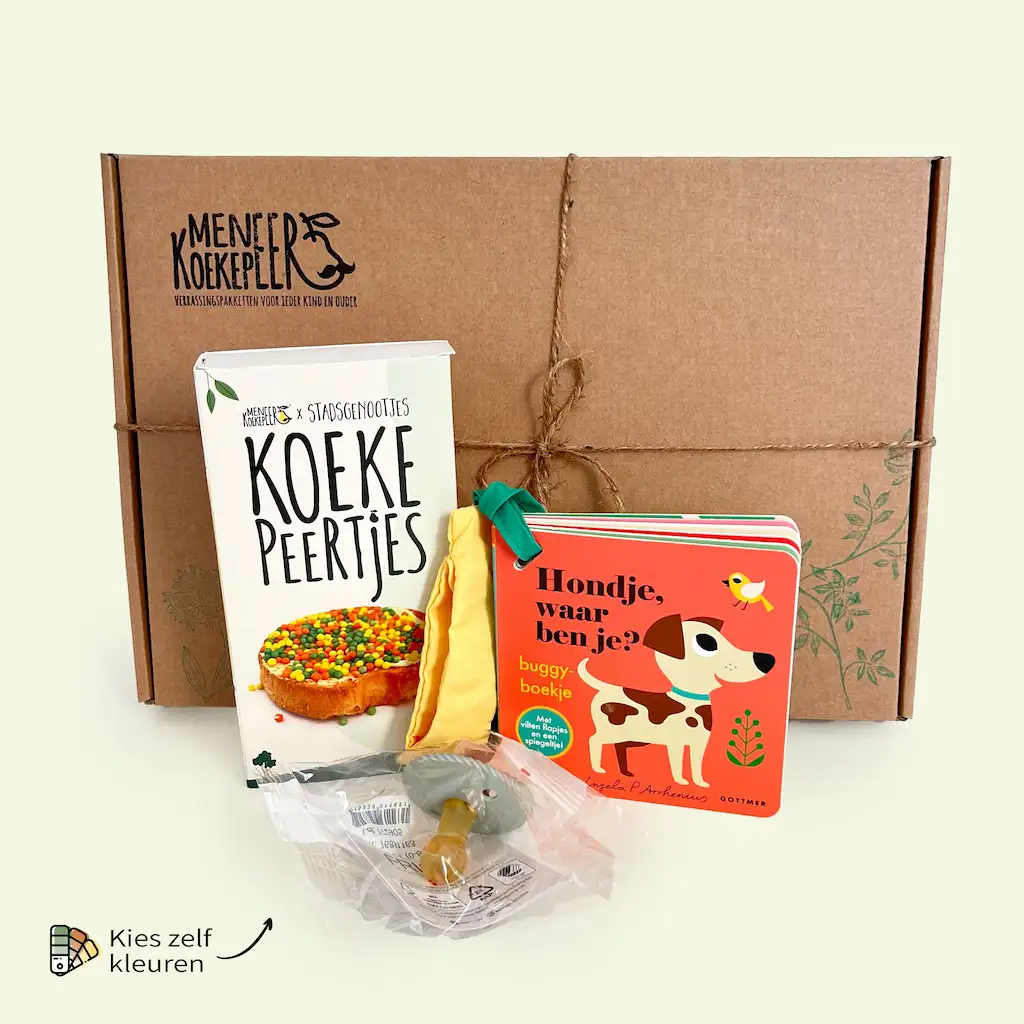 Kraamcadeaus geven zonder dat je zelf op pad hoeft! In cadeaupakket baby – een fijne start zitten verschillende cadeaus die ouders en baby goed kunnen gebruiken. Het is een perfect cadeau voor tijdens een babyshower of wanneer je niet in de gelegenheid bent om zelf op kraamvisite te gaan, maar je wel wil feliciteren. Wij hebben dit ‘cadeaupakket baby – een fijne start – een fijne start,’ zorgvuldig gevuld met duurzame cadeaus die goed te gebruiken zijn in de eerste 6 maanden van de baby. Hondje, waar ben je – buggyboekje t.w.v. € 9,99Dit kartonnen buggyboekje is handig voor onderweg. Onder de flapjes van dit boek zitten allerlei kleine beestjes verborgen, zoals een hondje, een poes en een hamster. Extra leuk is dat de flapjes van vilt zijn gemaakt: lekker handig én stevig dus! Frigg speen t.w.v. € 4,95 Natuur rubberen speen in de kleur cappuccino. Deze speen heeft een nieuw design, maar nog wel zo neutraal mogelijk. Deze speen is speciaal voor baby’s in de leeftijdscategorie van 0 tot 6 maanden (T1) Doosje Koekepeertjes t.w.v. € 4,50 Ons eigen feestelijke strooibeleg smaakt net als de originele muisjes naar anijs en zijn een mix van olijf, oker en roest oranje kleuren. De Koekepeertjes zijn 100% vegan en glutenvrij.