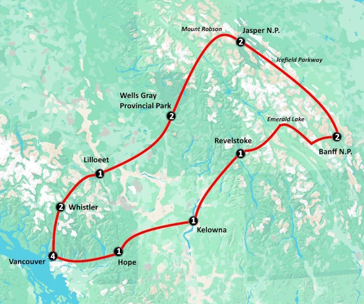 Stap in uw camper en ontdek het adembenemende West-Canada. Uw avontuur begint in het bruisende Vancouver, waarna u doorreist naar de Okanagan-vallei, het hart van de Canadese wijnstreek. Hier, in Kelowna, geniet u van zonovergoten wijngaarden en proeflokalen met spectaculaire uitzichten. Vervolgens trekt u verder naar de ruige wildernis van Banff en later Jasper National Park, waar gletsjers en diepe valleien u opwachten. De reis gaat verder door de ongerepte natuur van Wells Gray Provincial Park en eindigt in het charmante Whistler, beroemd om zijn avontuurlijke sfeer en indrukwekkende berglandschappen.